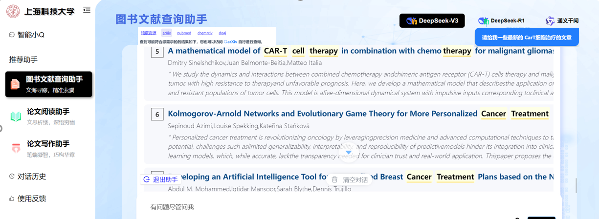 1.在上海科技大学图书文献查询助手中输入所需文献的领域方向,如“请给我一些最新的Car-T细胞治疗的文章”。该助手可从ArXiv、PubMed、Chemrxiv、Doaj等数据库查询相关文献。