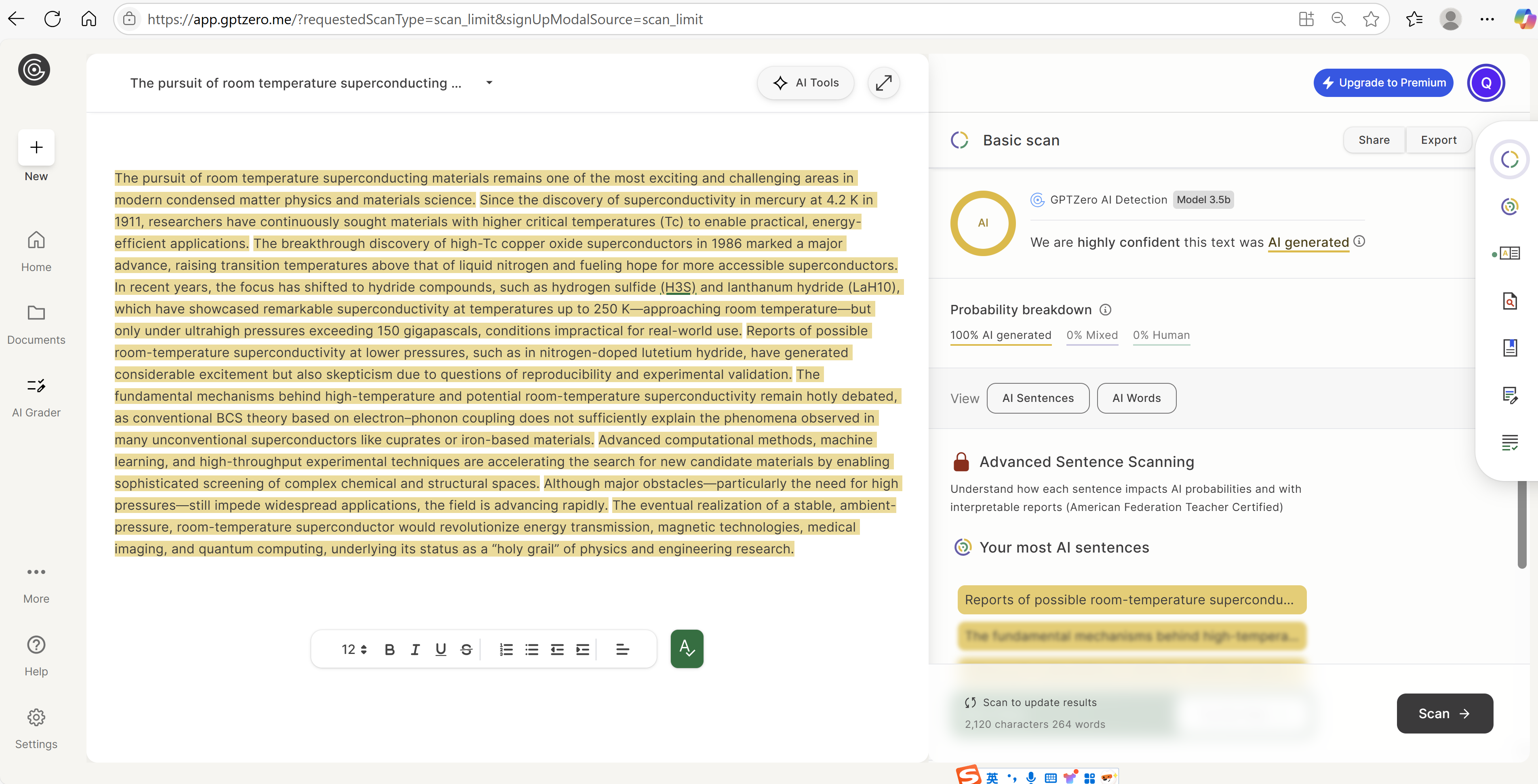 ·提供短语级分析(标记AI 措辞、混合内容),生成详细报告并细分 AI 影响区域;