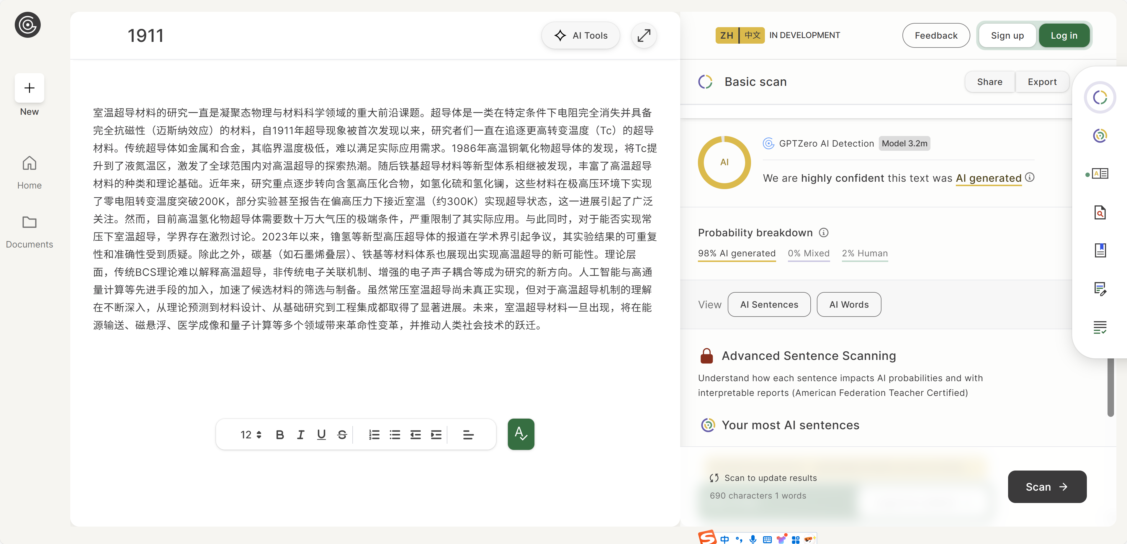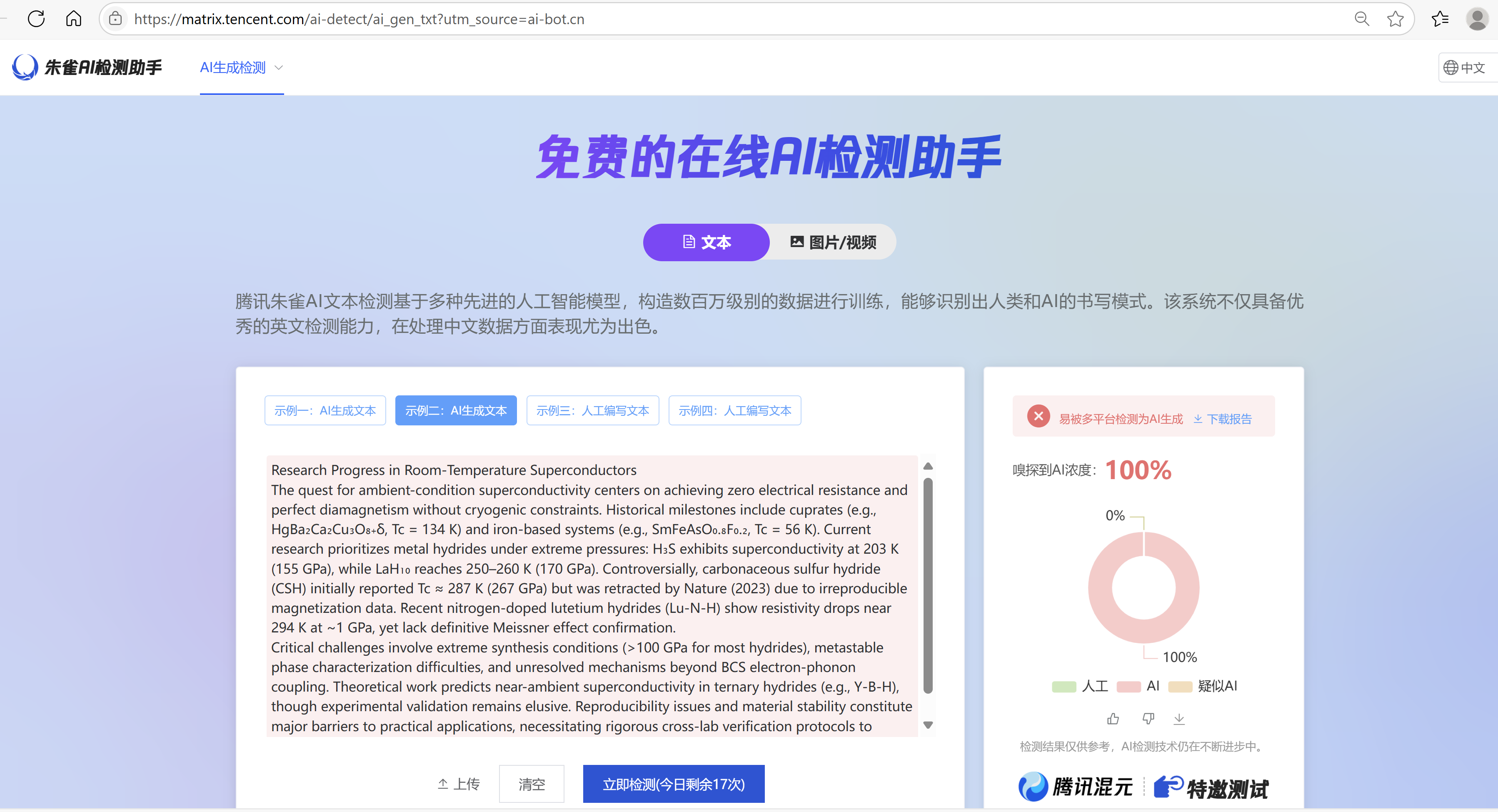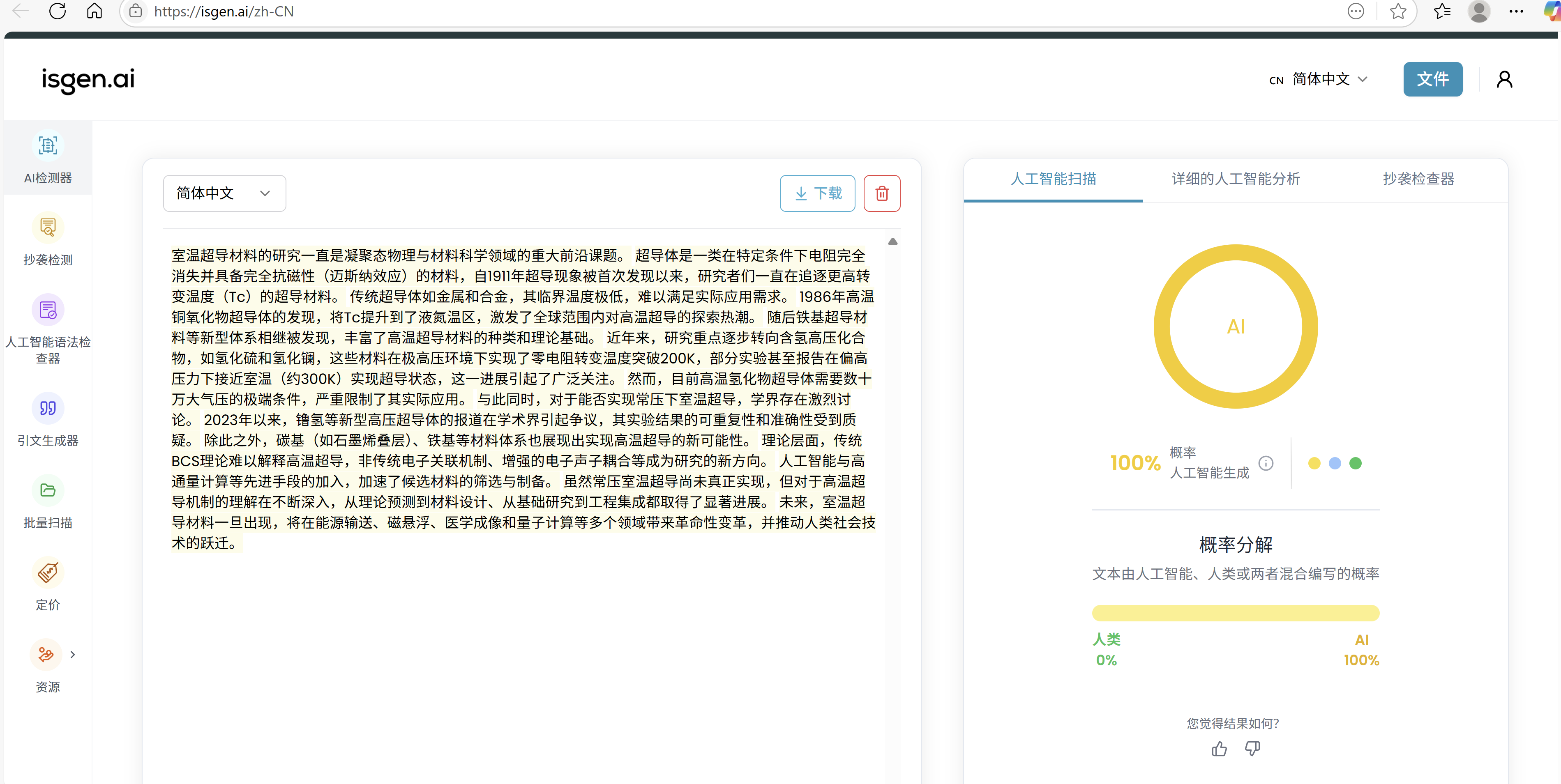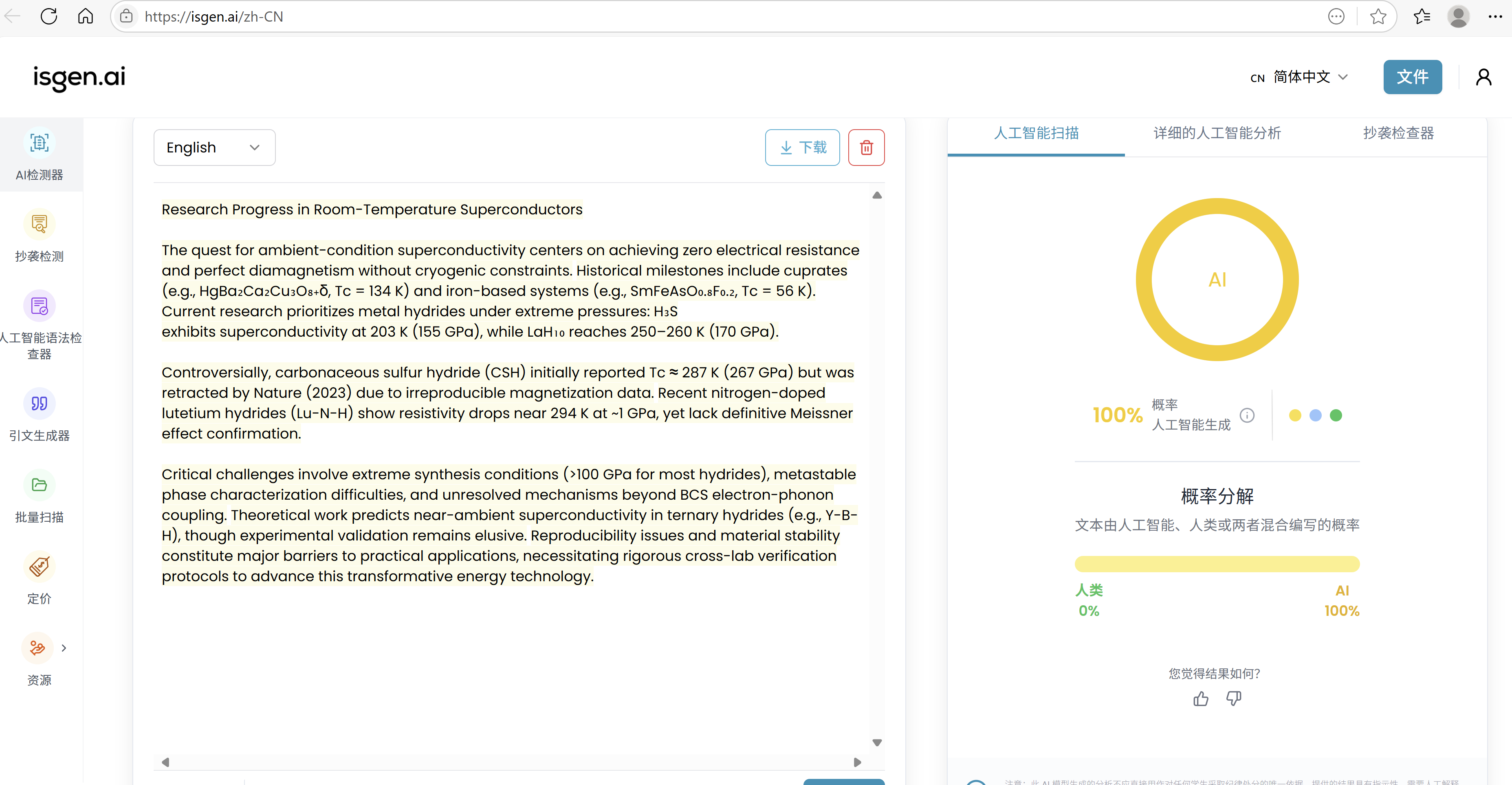 中文测试样本文本是利用GPT-4.1模型,文本生成提示词为:“写一段室温超导材料的研究综述,600字以内,写成连续的语句。”