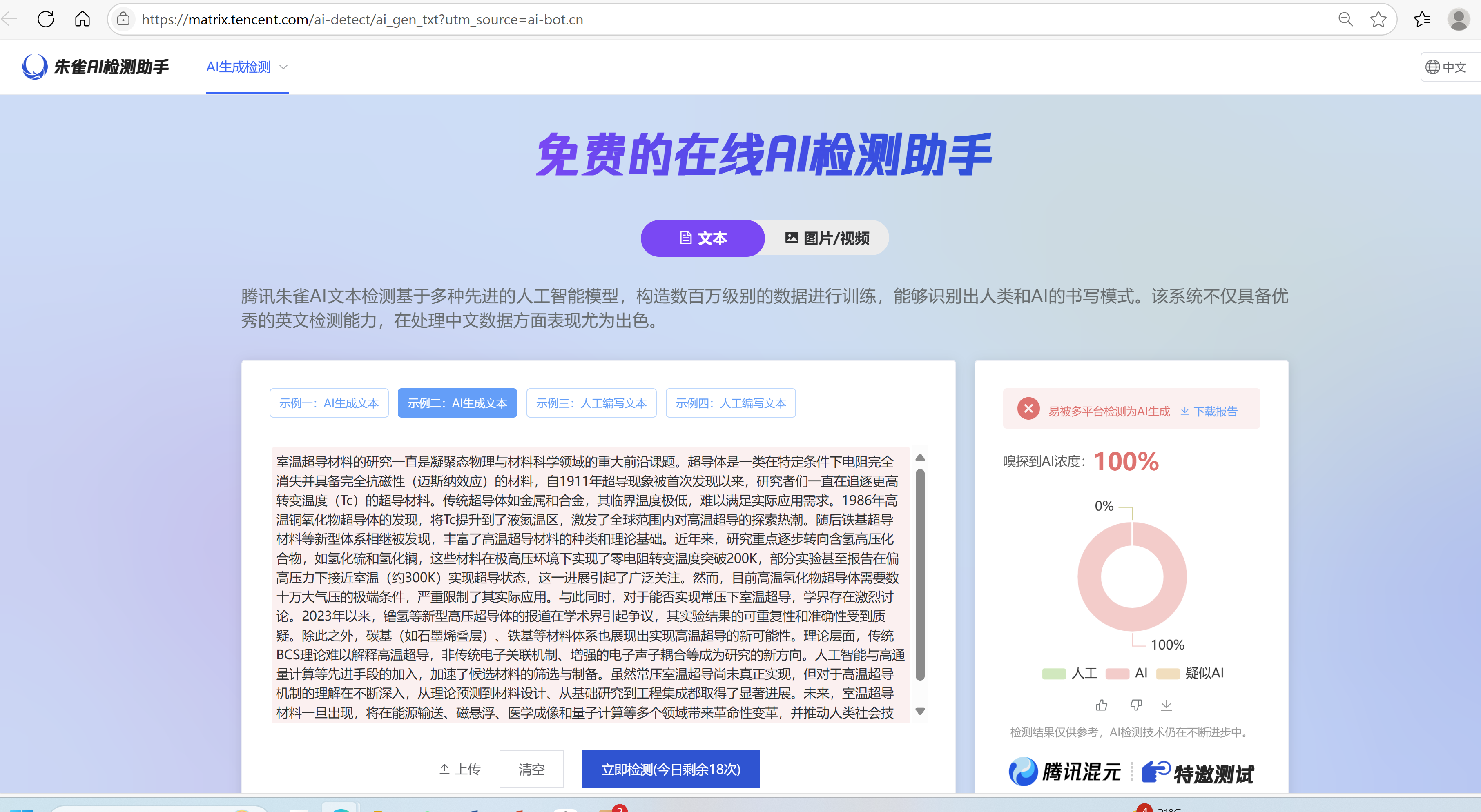 英文测试样本文本是利用GPT-4.1模型,文本生成提示词为:“write review paragraph about room temperature superconduting materials, in 300 words”