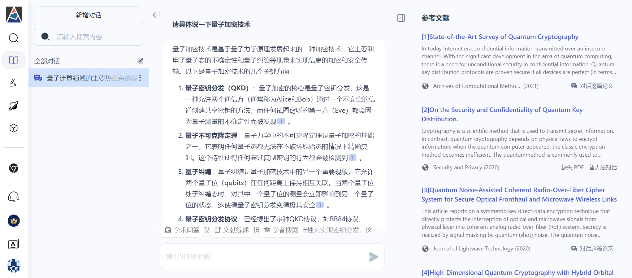 2.结果页面快速回答出量子领域的主要热点,同时针对每个子领域给出其定义的参考文献来源,右侧也给出了一些参考文档可点击查看或与文献对话。
